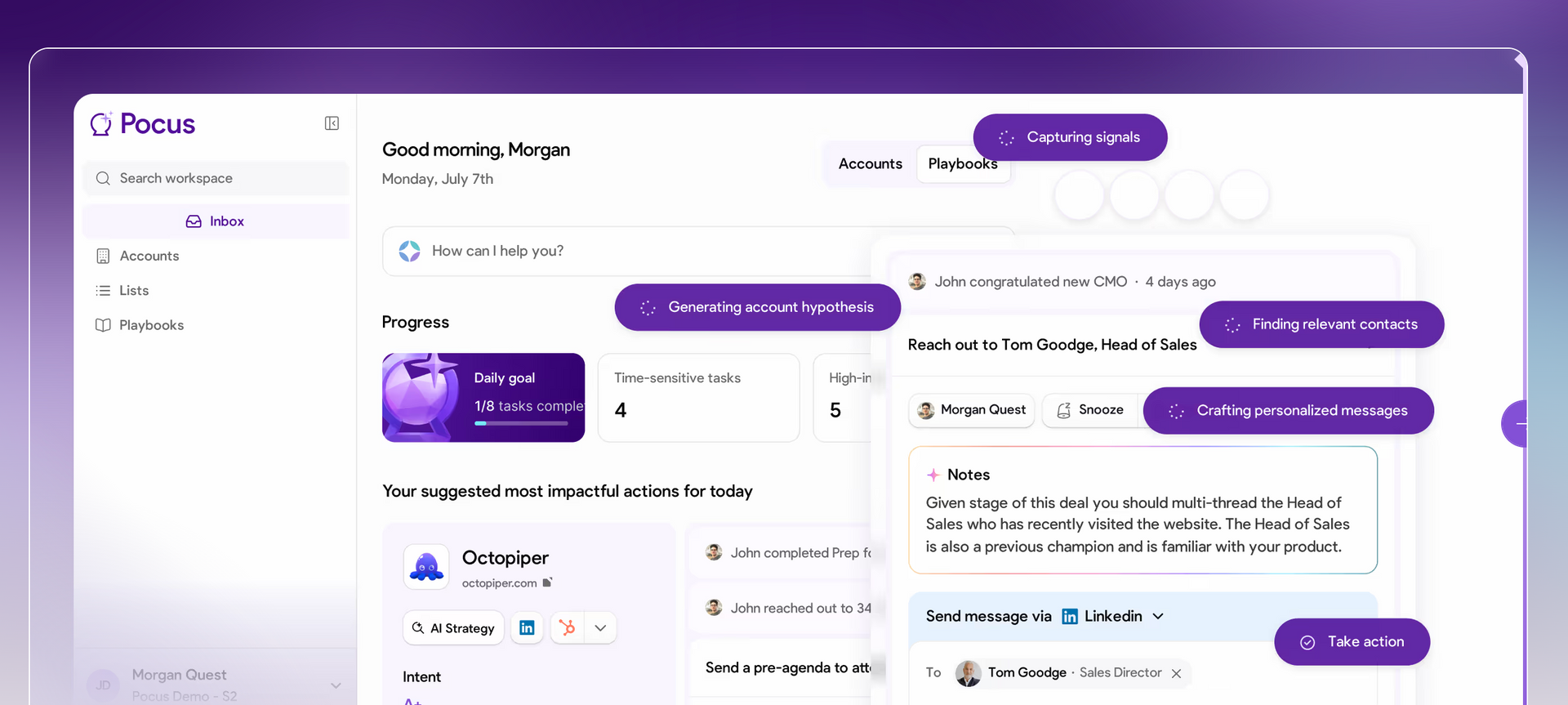 Esse é o gap que a Pocus preenche. Não é outro banco de dados de contatos. Não é mais uma ferramenta de sequenciamento. É uma camada de raciocínio sobre sinais que combina dados internos (CRM, uso de produto, e-mails, gravações de calls) com dados externos (intent de Bombora, job postings, notícias, 10-Ks) para gerar recomendações priorizadas e acionáveis para cada rep.